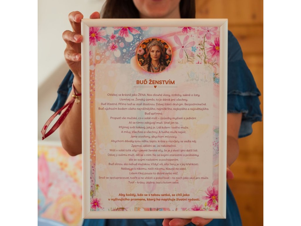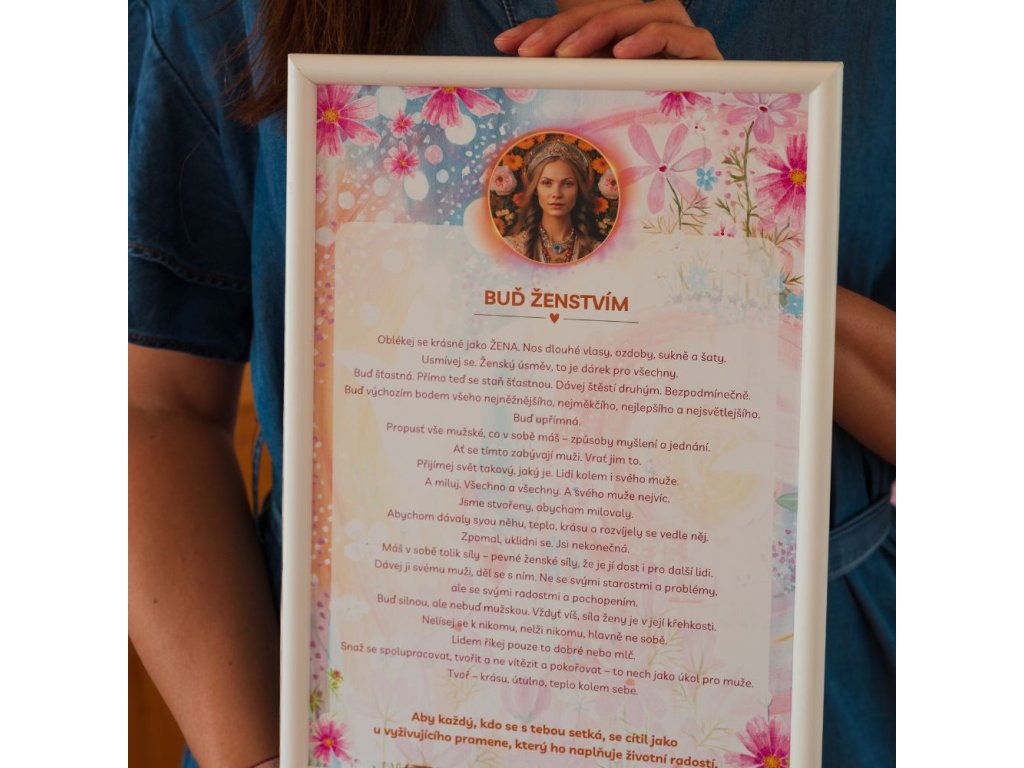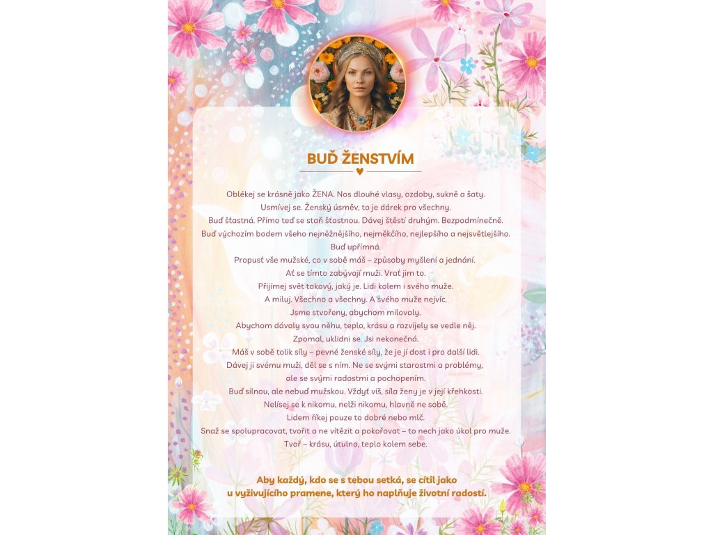 Obrázek s bílým okrajem: MOTIVAČNÍ OBRAZ PRO ŽENY BUĎ ŽENSTVÍM - POSELSTVÍ BOHYNĚ LADY