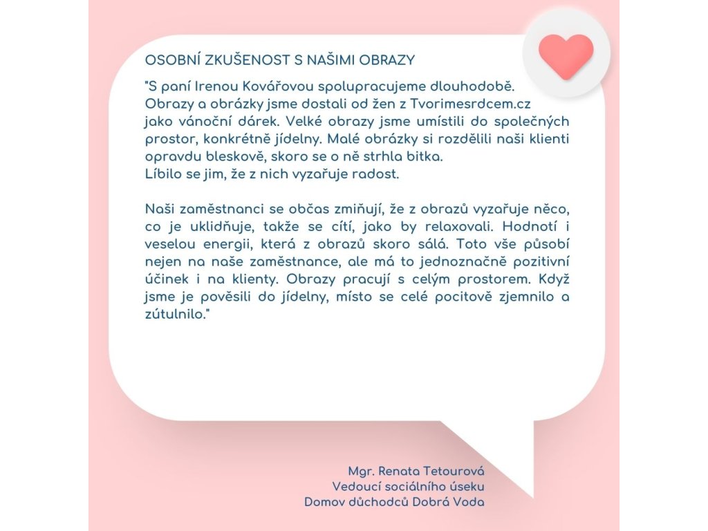 „Každý obraz, který někdo namaluje, nese určitou energii. V současné době mnoho obrazů nese energii smutku znechucení, lítosti či vulgarity. Tato energie pak působí v životě majitele obrazu. Protože si velmi uvědomuji a cítím velkou zodpovědnost za to, co vnáším obrazem do vašich domovů, tvořím své obrazy zásadně s myslí odproštěnou od veškerých negativních myšlenek. Bez jakýchkoli negativních emocí. Naopak v prožívání hlubinné radosti a lásky. Léčivé obrazy, které vám nabízíme, vznikají v prostoru obklopeném krásnou zahradou za zvuků přírody a léčivé hudby. Vznikají s touhou zprostředkovat vám potřebu zdokonalovat svůj život a životní prostor.“ Vaše Irena
