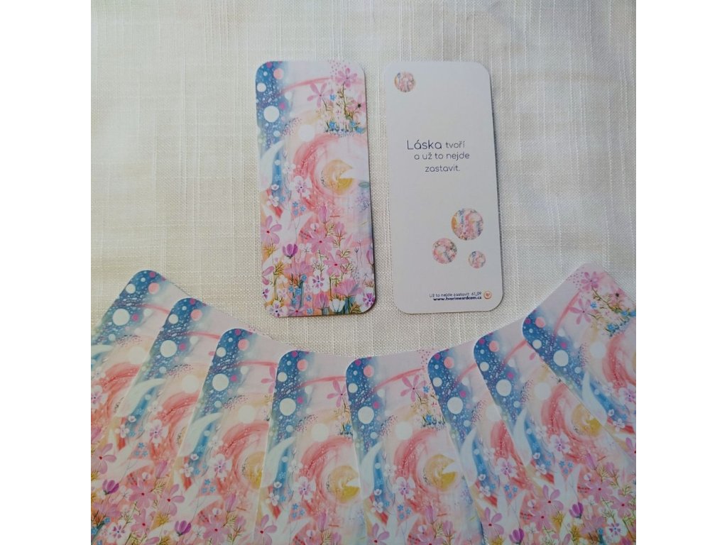 Záleží na tom co čteme a čím vyživujeme zahradu naší duše. Naše záložky jsou tvořeny harmonizačním obrazem a aktivační větou na zadní straně. Slovo je kód. Užijte si chvíle s knížkou, příběhy a emocemi.